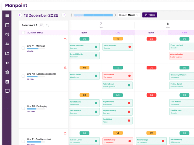 Planpoint traduit automatiquement les commandes et volumes de production en dotations appropriées : combien de personnes vous avez besoin, avec quelles compétences, reliées aux lignes de production et aux shifts. Ainsi, vous évitez la sous- ou la sur-dotations et travaillez plus efficacement, plus productivement et avec une approche humaine — le tout avec une solution unique qui parle à la fois le langage de la production et des RH.